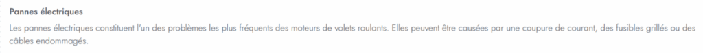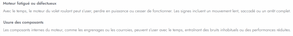 - Le volet ne remonte plus ou ne descend plus : il peut s’agir d’un problème électrique ou mécanique.
